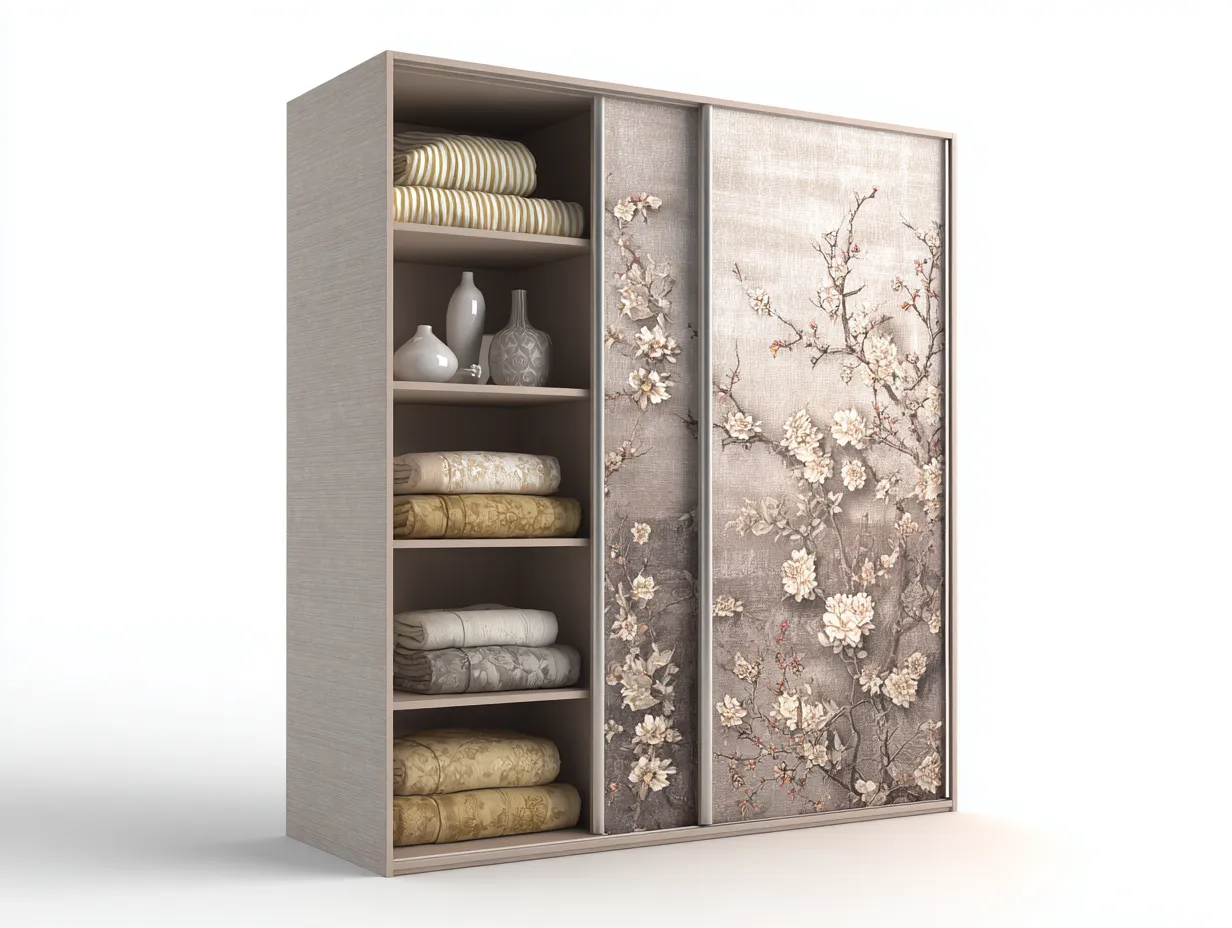 Armadio con ante scorrevoli-legno-tessuto-118x60x200 cm-Beige-Marrone chiaro-stile naturale decorativo